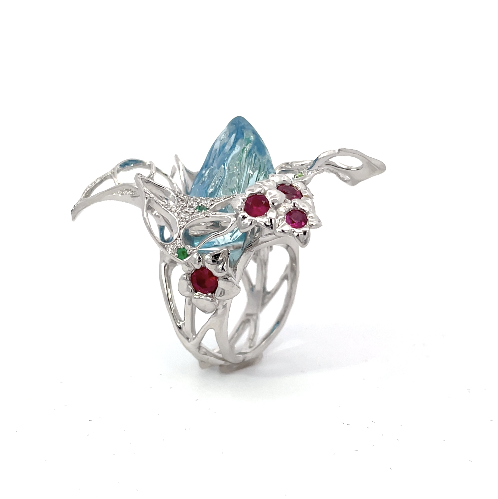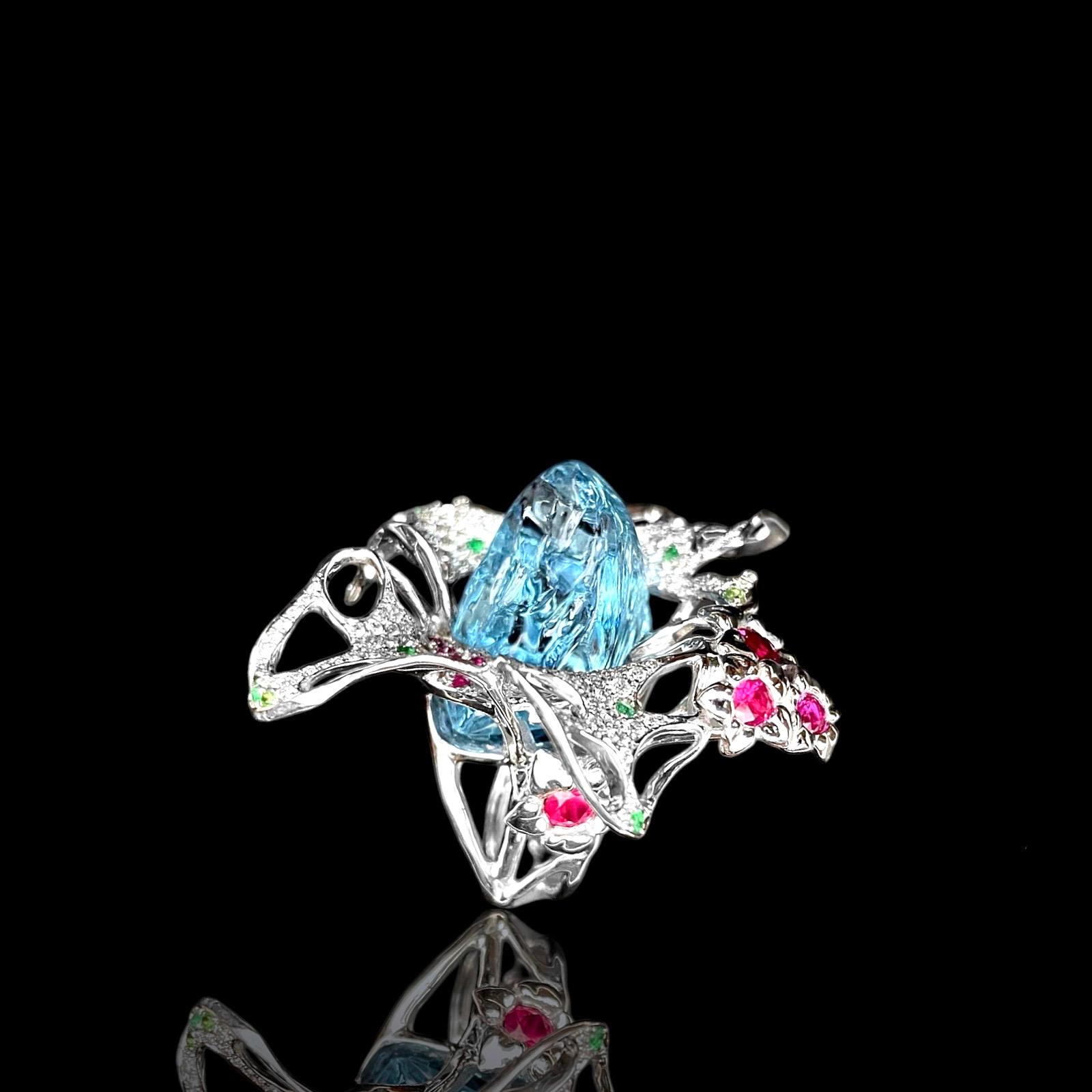 | Gemstones | 25.1 ct. rough aquamarine in the main flower, rubies in the smaller flowers, and small brilliant-cut paraibas and rubies in the petals of the main flower. |